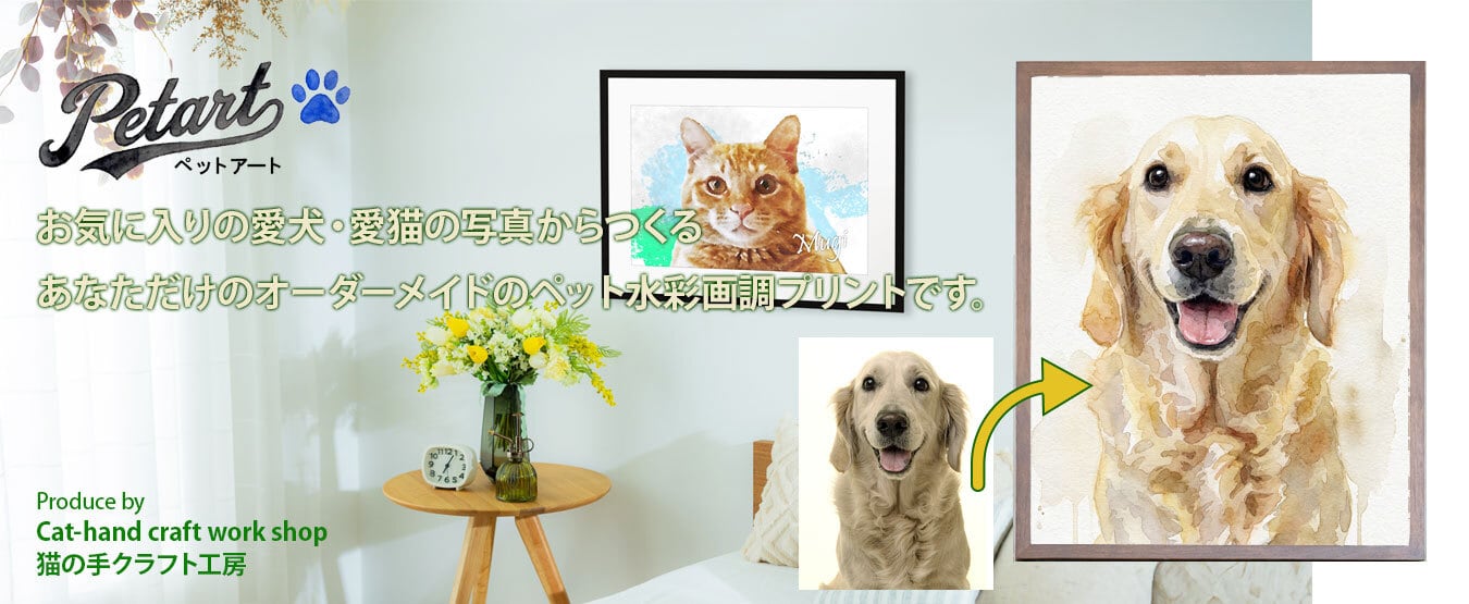 「猫の手クラフト工房」ハンドメイドショップです。お気に入りのペットの写真をあなただけの水彩画調アートポスターに加工しています。
